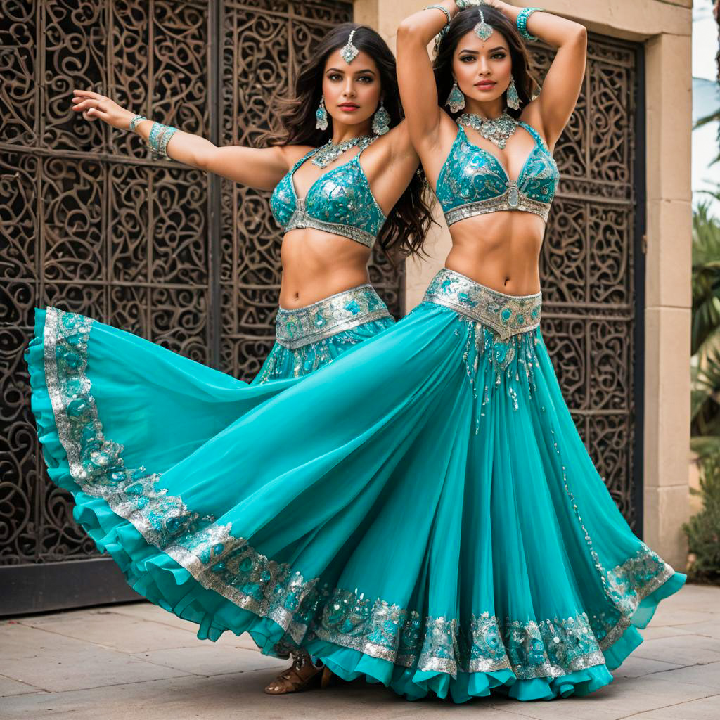 Belly dancer outfit, worn by daring dancer, featuring embellished bra top and flowing skirt, in vibrant turquoise and silver.