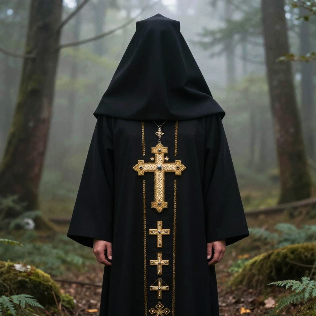 Orthodox robe draped on a serene monk in a misty forest, ornate crosses and detailed stitch work glowing subtly, peaceful atmosphere, nature blending with spiritual aura