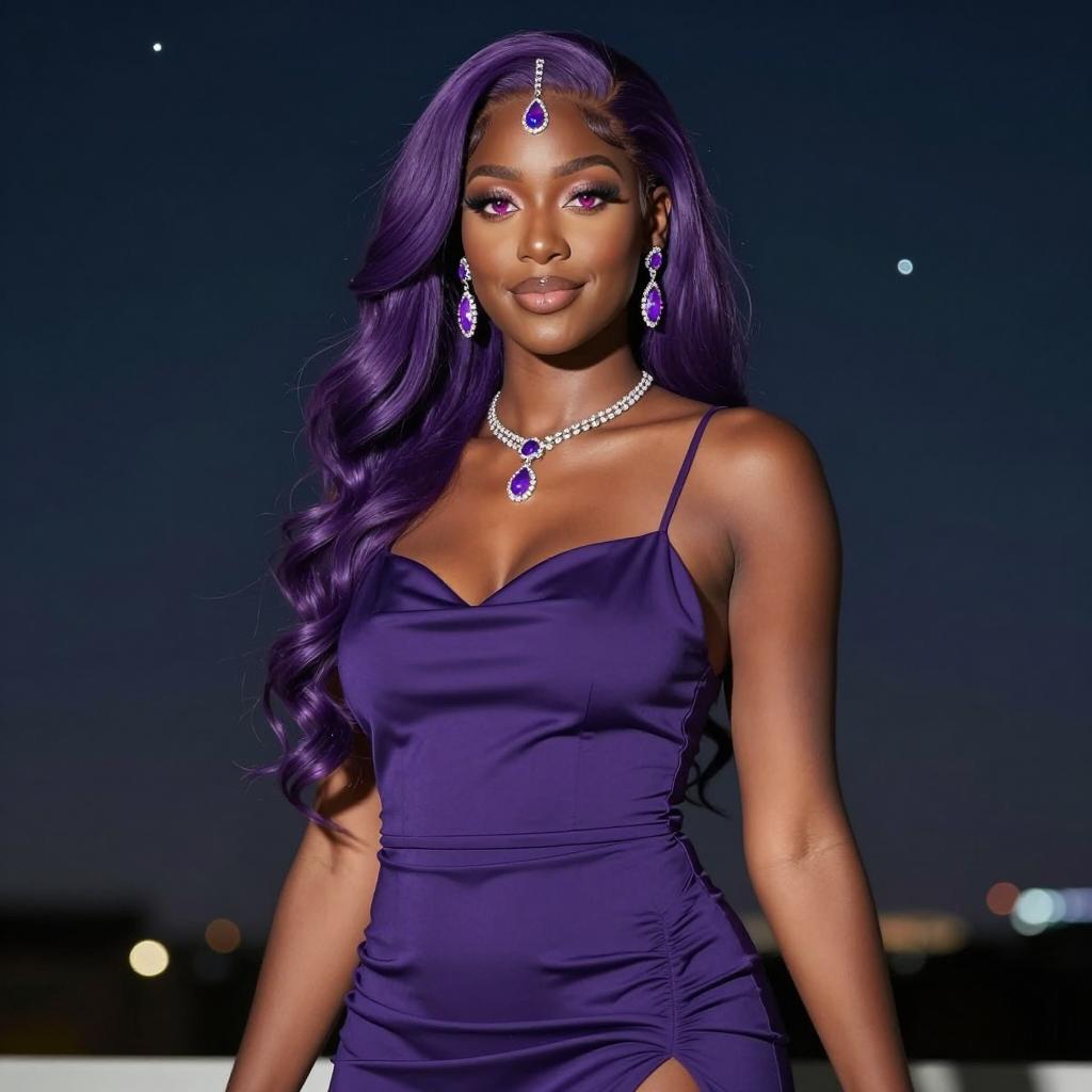 1girl, solo, breasts, jewelry, purple hair, cleavage, earrings, looking at viewer, long hair, necklace, side slit, smile, dark skin, medium breasts, dark-skinned female, dress, bare shoulders, forehead jewel, purple eyes, skirt, pink eyes, night, star (sky), closed mouth, sky
