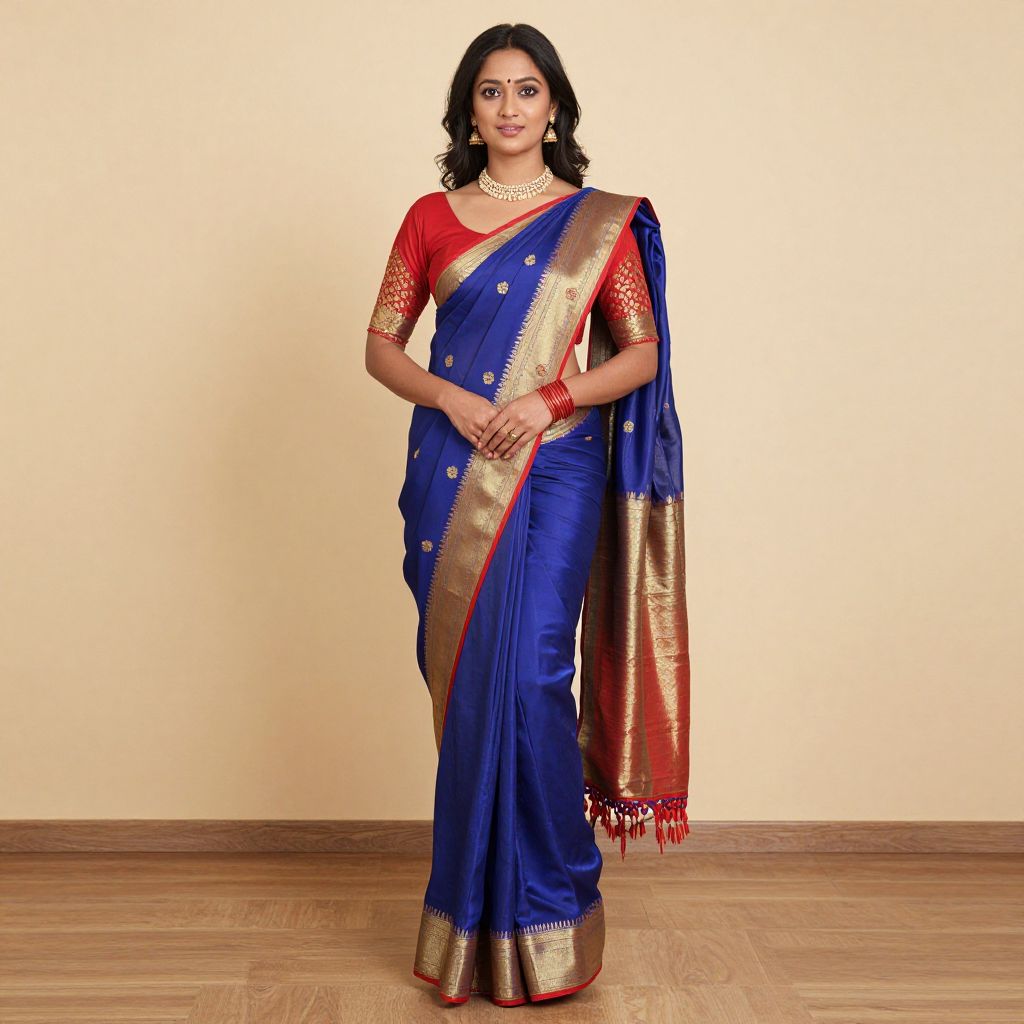 Photograph of a South Asian woman standing against a plain beige wall on a wooden floor. She has medium brown skin, long black hair, and is wearing a vibrant blue silk sari with gold and red borders. The sari has a red blouse with gold embroidery on the sleeves. She accessorizes with a gold necklace, red bangle on her right wrist, and small earrings. Her right hand holds the sari's gold-bordered pallu on her left shoulder. She stands confidently with a slight smile, exuding elegance and traditional Indian grace.