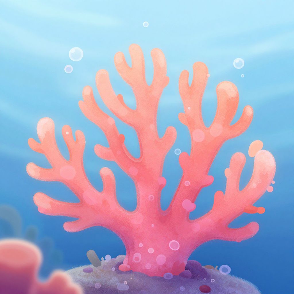 Cute coral drawing featuring vibrant shades of pink and orange, delicate branches with tiny bubbles rising around, set against a soft blue underwater backdrop, whimsical and charming style, intricate details, gentle lighting, perfect for children's book illustration.
