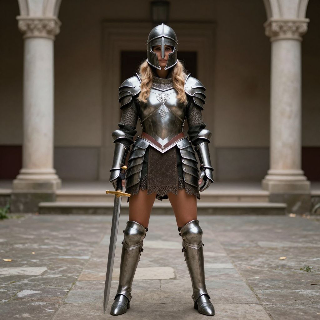 Photograph of a female knight in shiny black armor, long blonde hair, holding a sword, standing in a stone courtyard with columns.