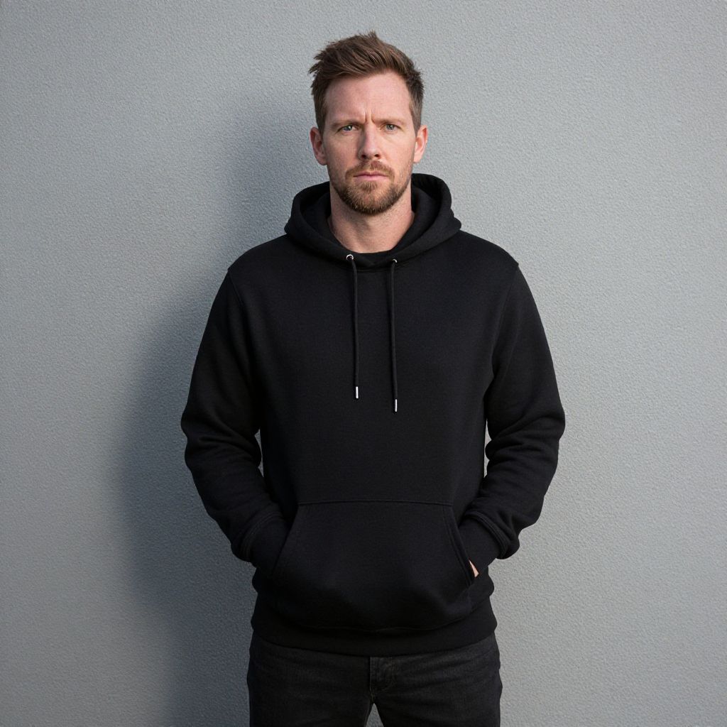 "Wilson Castaway, man in a black hoodie standing in front of a wall"