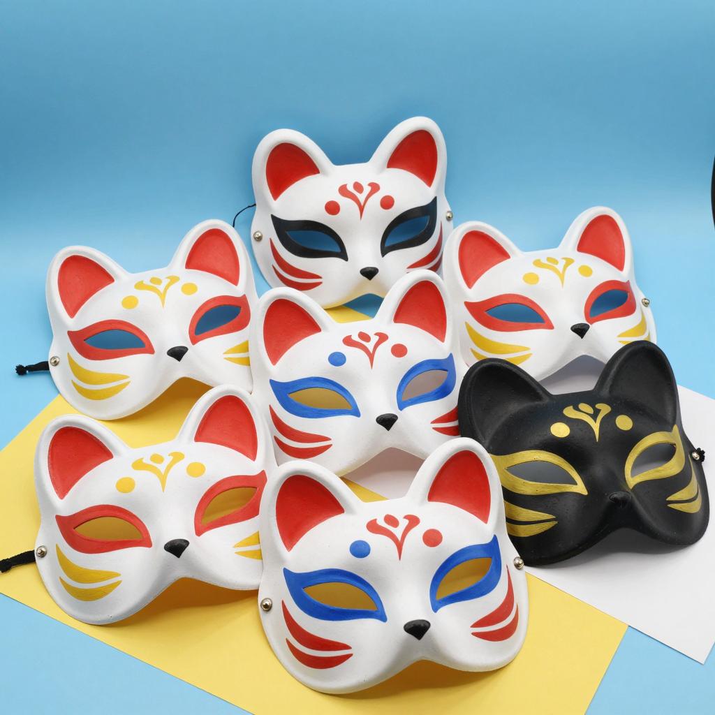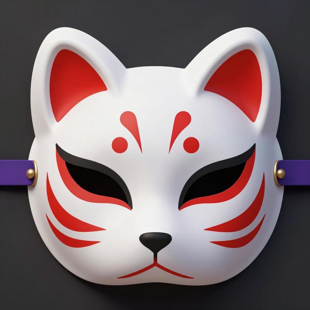 Digital illustration of a white fox mask with red inner ears, yellow eyes with black pupils, and red markings. The mask has black curved lines for eyebrows and whiskers. Dark background, purple strap on each side. Intense, narrowed eyes.