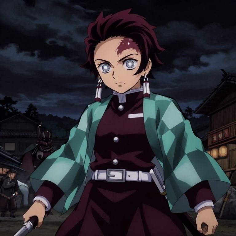 Dramatic scene of female demon slayer corps uniform fighter confronting demon at night, uniform detailed with battle wear, glowing eye intensity, dark swirling clouds overhead, traditional Japanese village in background, cinematic anime style, high contrast lighting