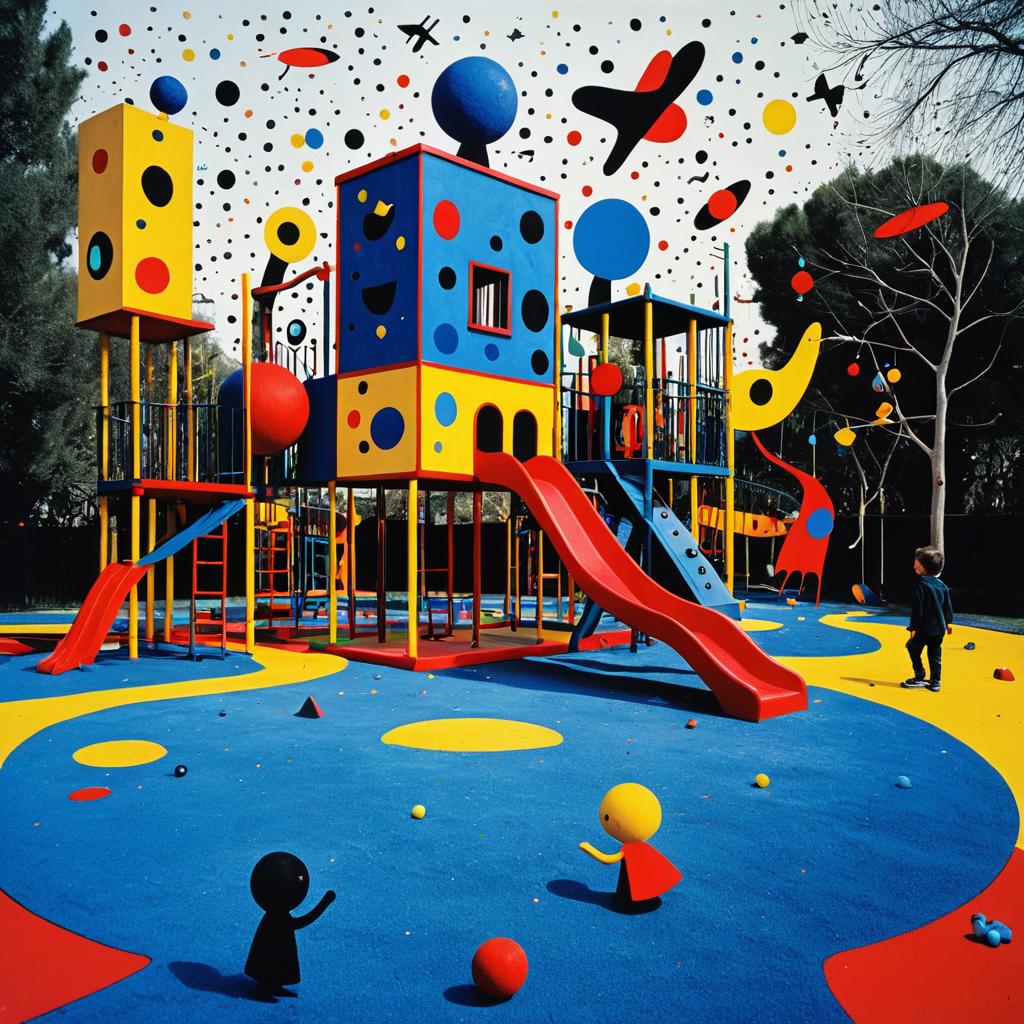 Artwork inspired by Joan Miró style, capturing a vibrant surreal playground, with abstract creatures, children, and colorful shapes, floating forms, contrasting black lines, and cosmic motifs, painted in primary reds, blues, yellows, and blacks, surreal and enchanting
