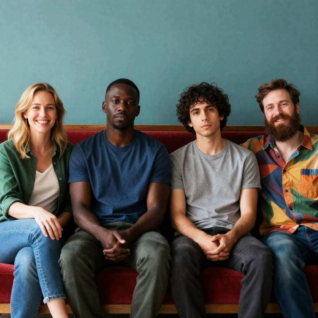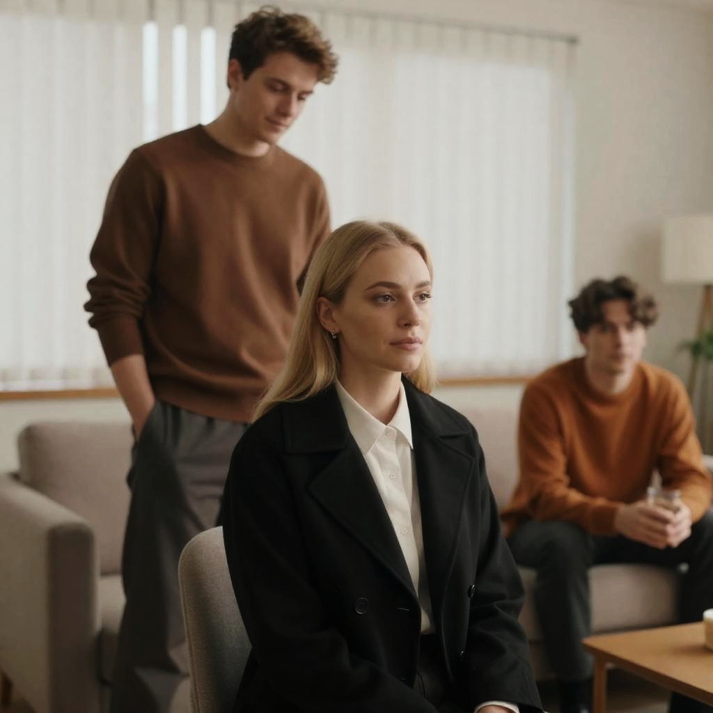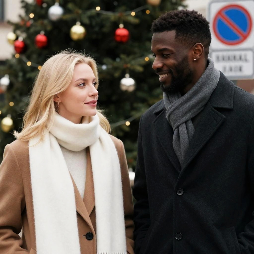 Photograph of a blonde woman with light skin wearing a beige double-breasted coat and a black-haired man with dark skin wearing a black double-breasted coat. They are standing side by side in front of a yellow-painted wall with an arched window featuring blue metal bars, both looking upwards with neutral expressions. Warm light casts soft shadows on the scene.