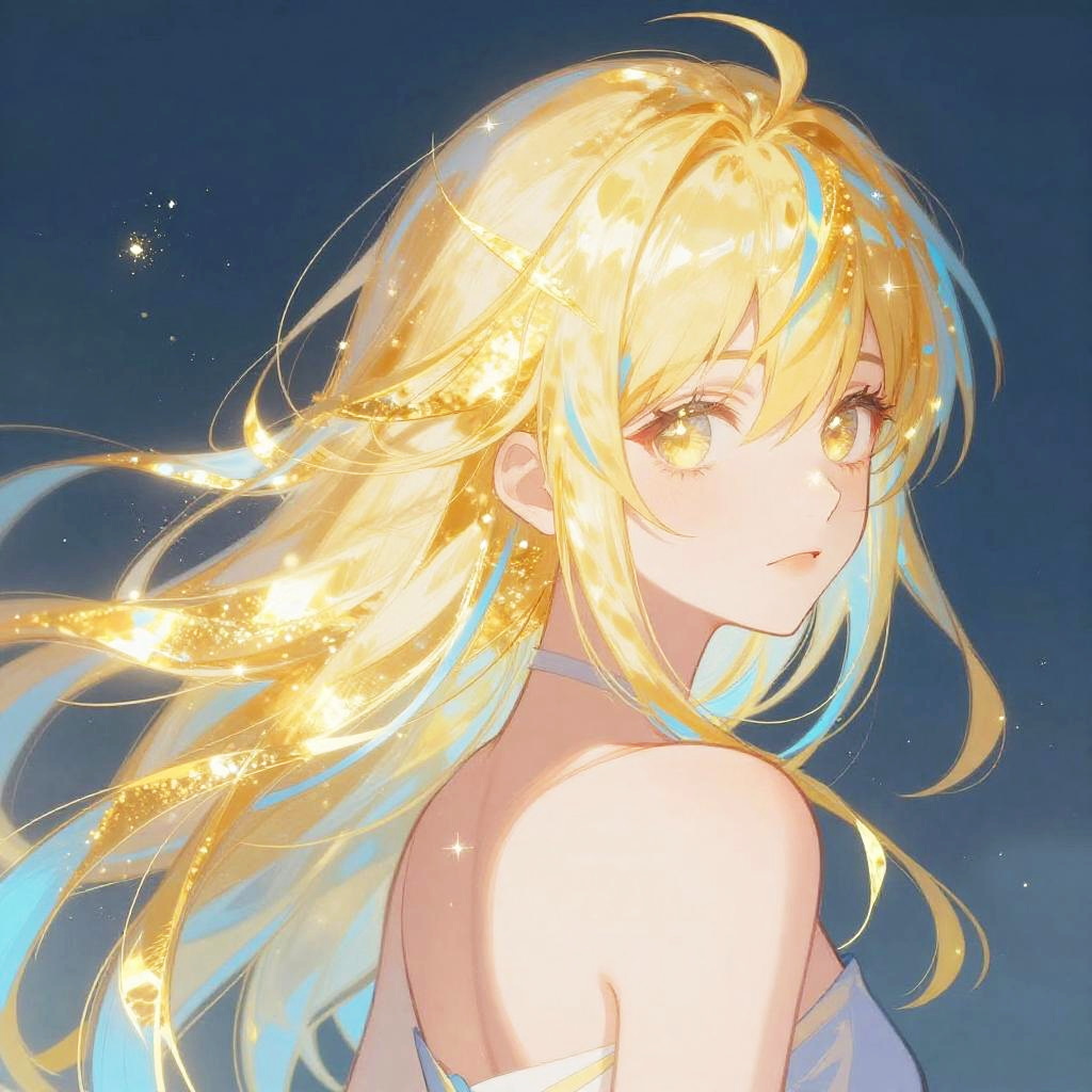 Hair highlights anime character with flowing long hair, shimmering golden and blue streaks, mystical aura surrounding, ethereal atmosphere, illustrated in bright colors with smooth gradients, sharp anime eyes reflecting light, digital painting style