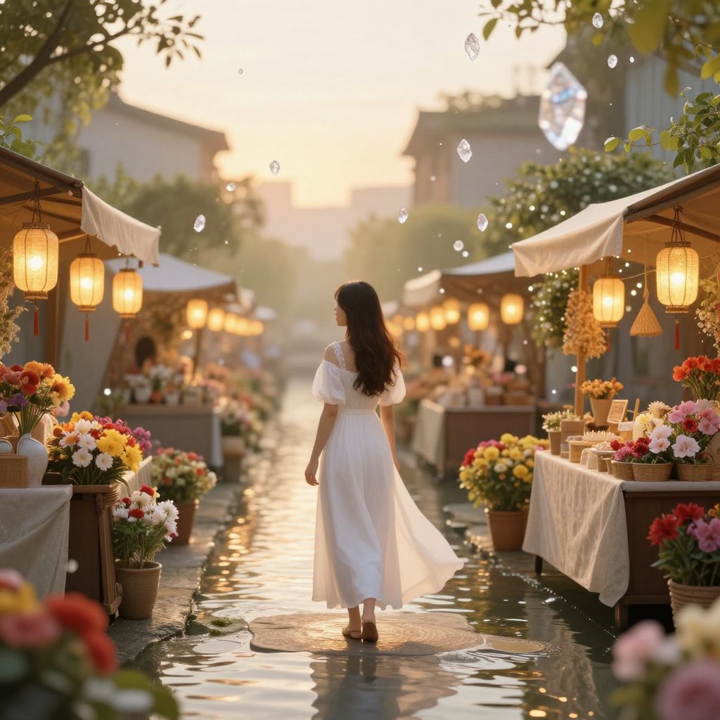 A serene digital art rendering depicts a woman in a flowing white dress standing amidst a tranquil canal lined with vibrant flower stalls, illuminated by warm, golden-hour lanterns that cast a magical glow over the scene, evoking a dreamlike atmosphere where crystallized memories seem to float in the air.