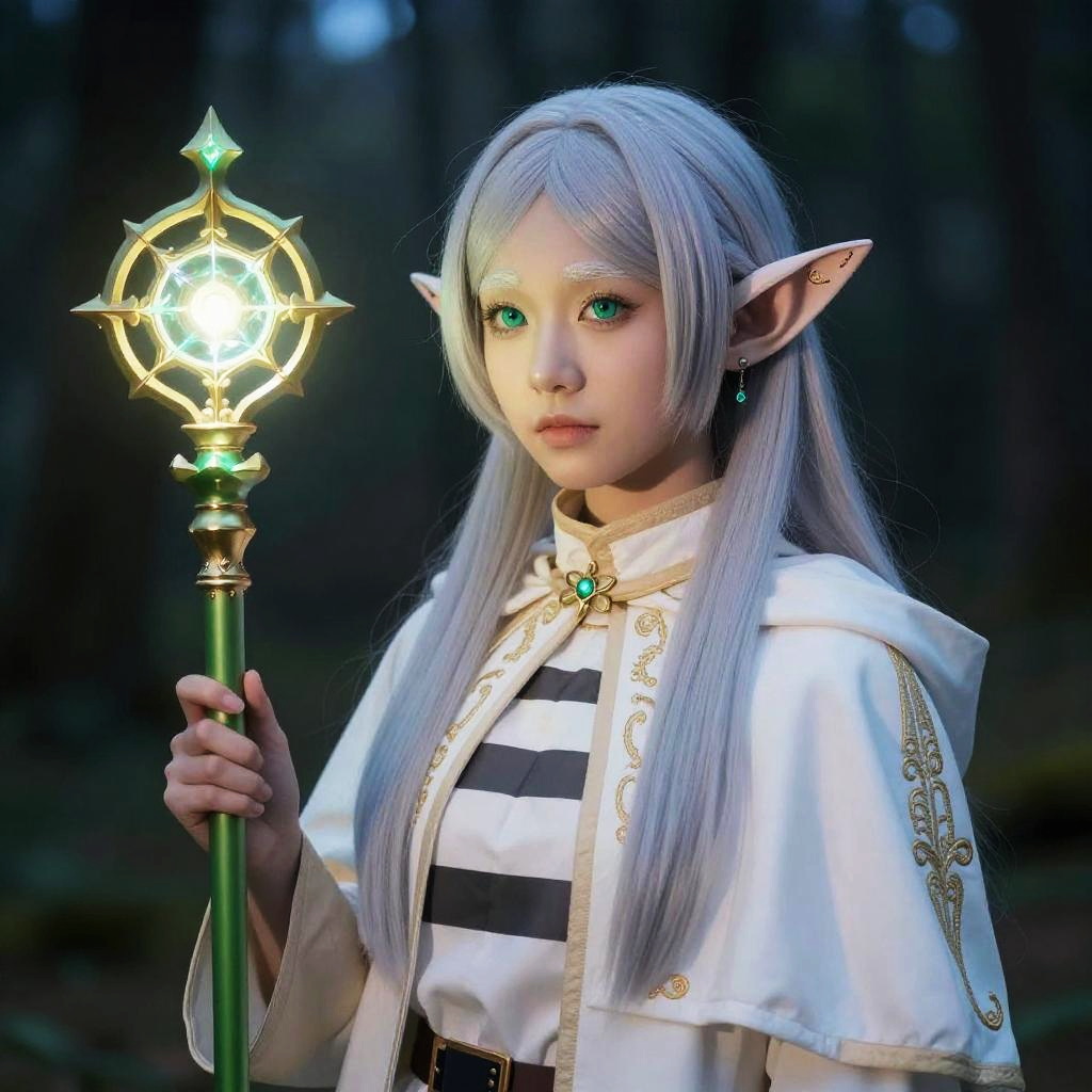 Elegant elf with long silver hair and emerald eyes, wearing a finely embroidered cloak, set against a twilight woodland background, holding a glowing magical staff, detailed ornate accessories, soft, dreamy lighting, fantasy art style