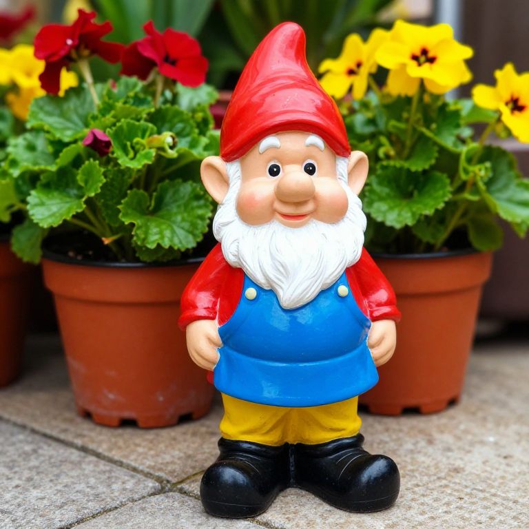 A colorful photograph of a garden gnome statue standing on a stone path. The gnome has a long white beard, red hat, red shirt, blue apron, yellow pants, and black boots. Behind him, there are potted plants with vibrant green leaves and red and yellow flowers. The sunlight creates a bright, cheerful atmosphere, highlighting the gnome's whimsical details.