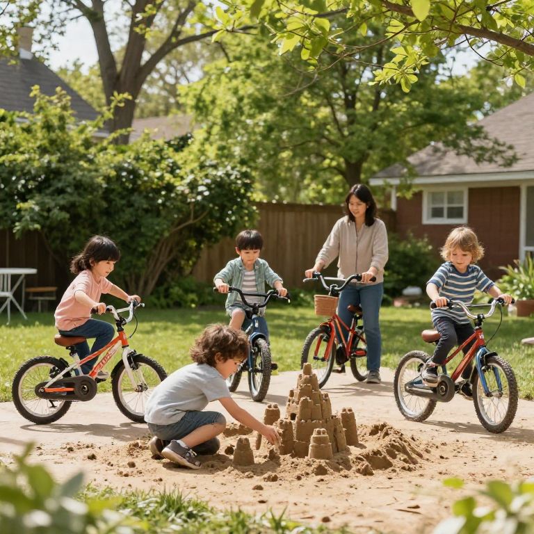 Kids pic prompt: A family gathering in a backyard during spring, kids playing with bicycles and building a sandcastle, soft natural sunlight, rich green trees, warm tones, candid and authentic moment, Dall-E inspired realism.