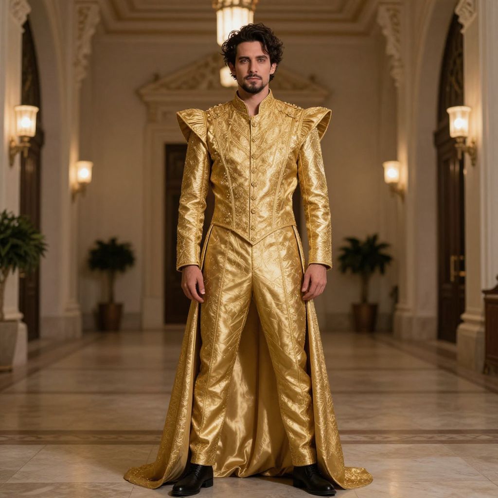 Photograph of a man standing in an opulent, dimly lit hallway with classical architecture. He has curly black hair and a beard, and is wearing an elaborate, long, gold-embroidered jacket with exaggerated shoulder pads and matching gold pants with a floor-length tail. His black shoes contrast with the shimmering gold outfit. The hallway features tall archways, ornate wall sconces with warm light, and potted plants. The floor is polished marble, and the overall ambiance is luxurious and grand. The man's confident stance and direct gaze add to the regal feel of the image.