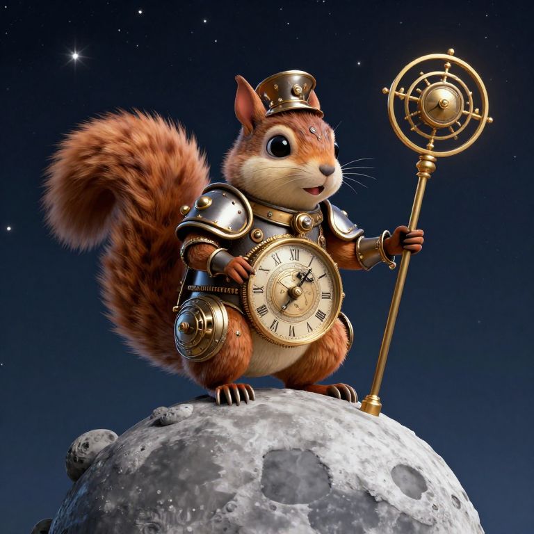 A digital CGI image of an anthropomorphic, reddish-brown squirrel standing on a moon-like rock against a starry night sky. The squirrel wears steampunk-style armor, including a brass helmet with a small visor, brass shoulder plates, and a large, round brass clock with Roman numerals on its chest. The squirrel also holds a brass staff with a circular top in its right paw. Its large, fluffy tail curves upwards. The moon-like rock has a textured, cratered surface. The overall style is whimsical and fantasy-themed, blending sci-fi and steampunk elements.