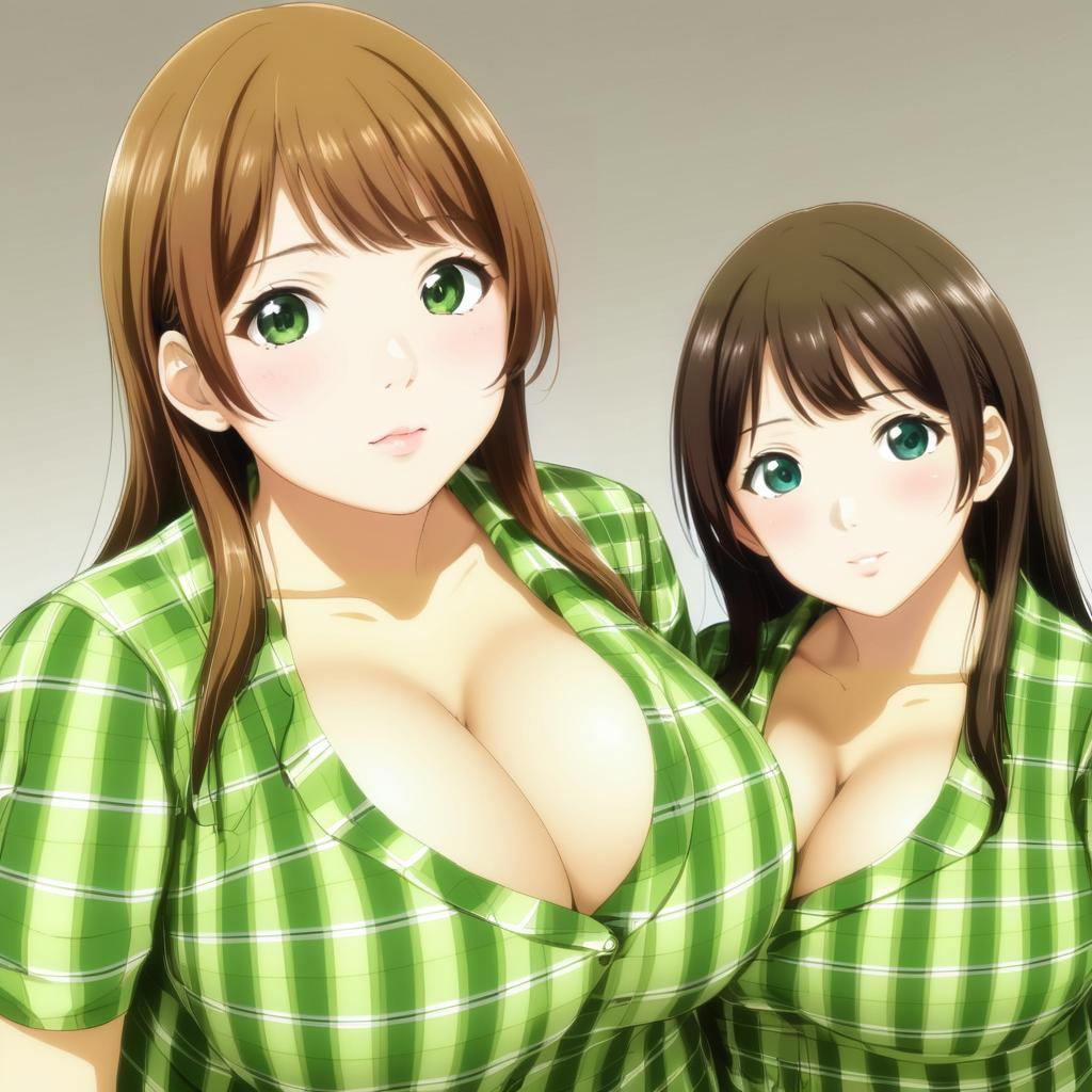 Mukai takumi, idolmaster, 1girl, green eyes, brown eyes, long hair, black hair, brown hair, parted bangs, large breasts, huge breasts, cleavage, navel, collarbone, by artist shimo (depthbomb), anime