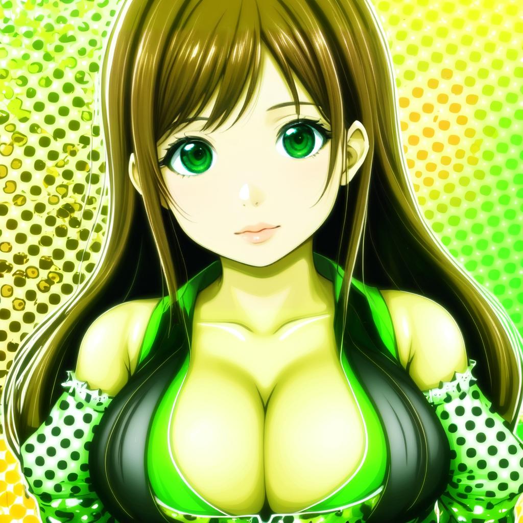 Digital artwork of an anime-style young woman with long brown hair, large green eyes, and parted bangs. She is wearing a green and black top with prominent cleavage and a polka dot sleeve design. The background features a yellow and green halftone pattern. The artwork is inspired by the style of the artist Shimo and resembles characters from the Idolmaster series.