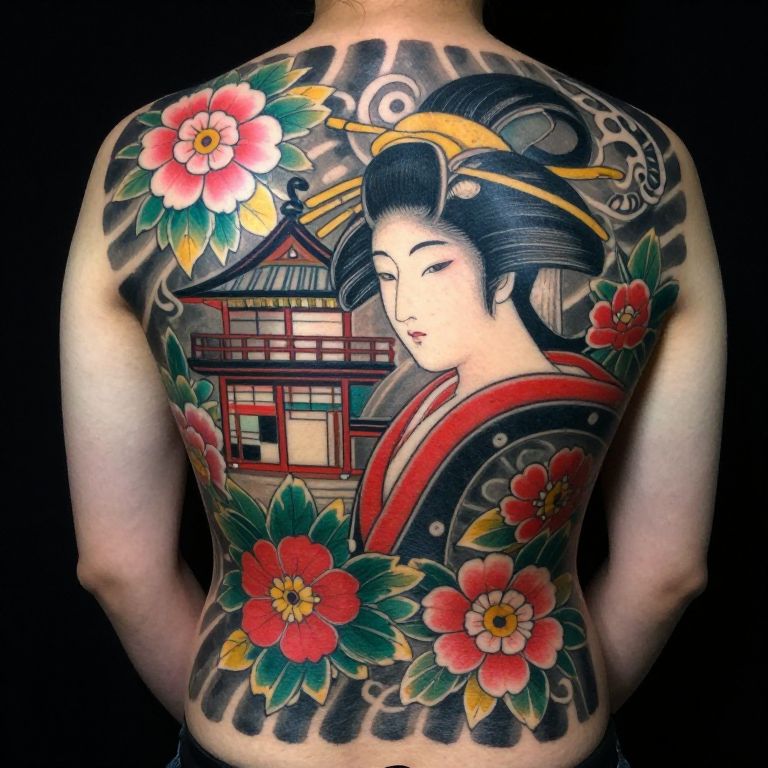 Tattooed Asian woman with intricate, colorful back piece featuring traditional Japanese woman, ocean waves, and vibrant flowers on dark background.