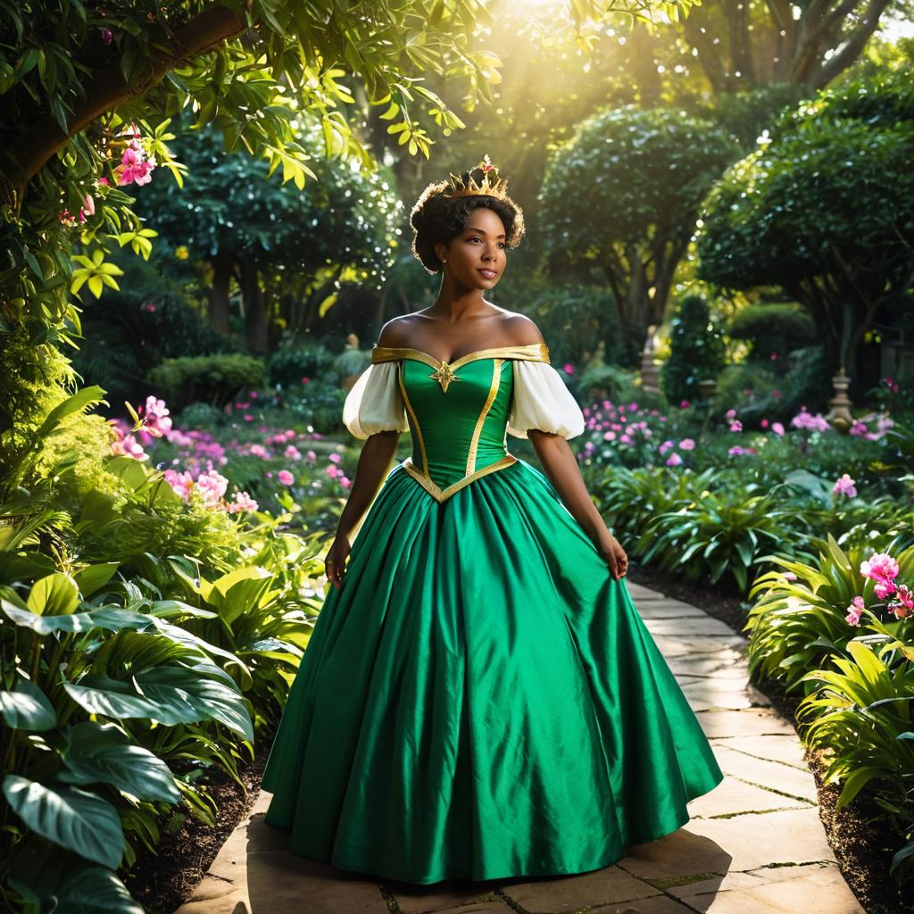 Tiana cosplay dress, photo of young Black woman, wearing a green and gold fairy tale princess dress with off-shoulder white sleeves, gold crown, dark hair in an updo, standing in a lush garden, sunlight filtering through leaves, pink flowers in the background, realistic CGI style, detailed ures, soft lighting, elegant and graceful pose, Disney-inspired, fantasy setting, high-quality digital art