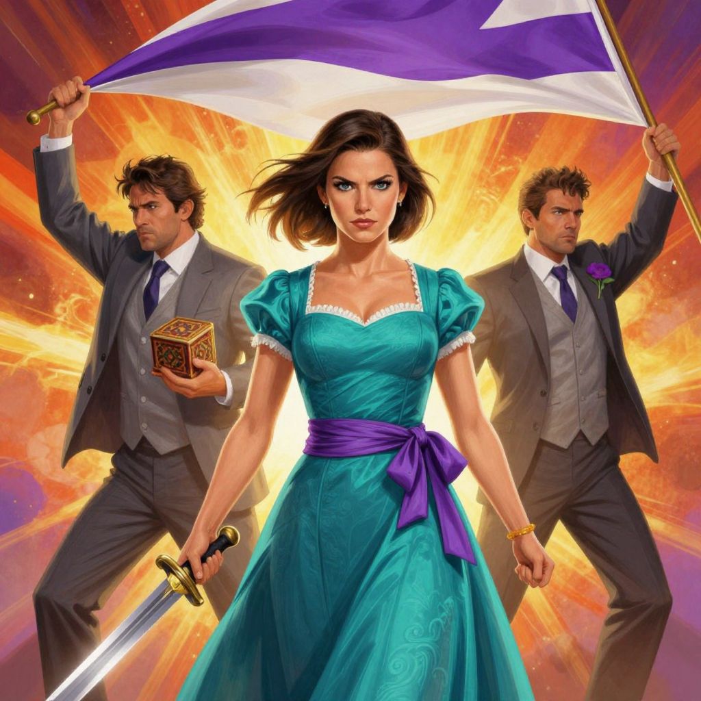 In this dynamic and vivid illustration, a woman in a striking teal dress with a purple sash stands at the forefront, her expression determined and her gaze fixed forward. She holds a small, ornate box in her left hand and a sword in her right, exuding a sense of strength and purpose. Behind her, two men, one on each side, are caught in the midst of a demonstration. The man on the left, dressed in a gray suit, has his arm raised, while the man on the right, in a suit with a purple flower, holds a flag aloft. The flag, with its bold purple and white colors, adds a dramatic flair to the scene. The background is a burst of warm, fiery hues, suggesting a passionate and intense atmosphere. The overall composition, with the woman in the center and the men flanking her, creates a sense of unity and determination, while the dynamic colors and textures add depth and vibrancy to the illustration.
