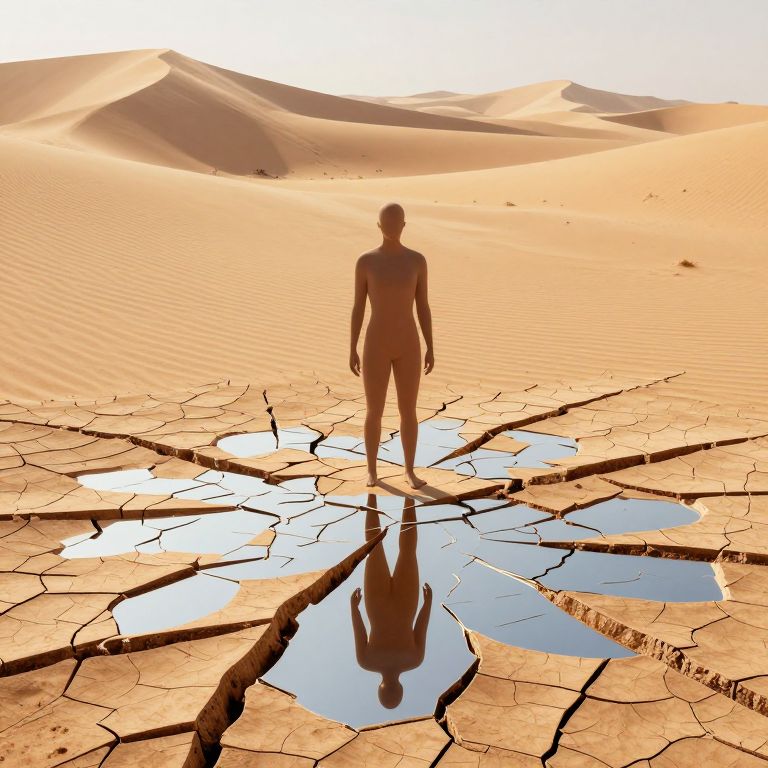 A photograph depicts a silhouetted nude person standing in a cracked, dry desert landscape with shallow puddles reflecting their image. The person has a slender build and is positioned centrally, facing forward. The background features rolling, sunlit sand dunes under a bright, almost white sky. The cracked earth, with its irregular, geometric patterns, contrasts with the smooth, rippling sand. The warm, golden hues of the sand and cracked earth create a stark, surreal visual effect. The image captures a sense of isolation and serene beauty in the harsh desert environment.