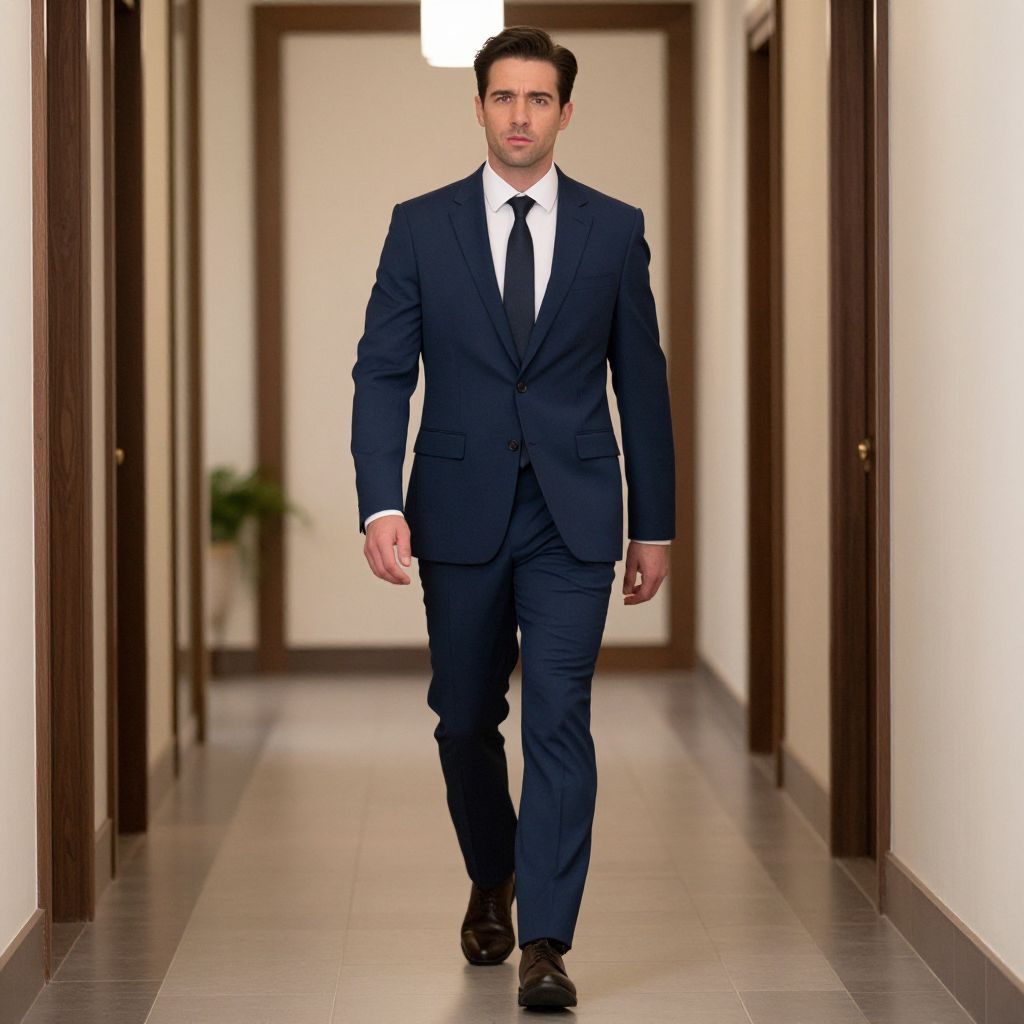 Photograph of a Caucasian man with short dark hair, walking down a narrow, well-lit hallway with beige walls and brown wooden doors. He is wearing a dark blue, tailored suit with a white dress shirt and black tie, and black dress shoes. His expression is neutral, and he is centered in the frame. The hallway has a potted plant visible to the left, and the floor is tiled in a light gray color. The lighting is bright, highlighting the man's formal attire and the clean, simple design of the hallway.