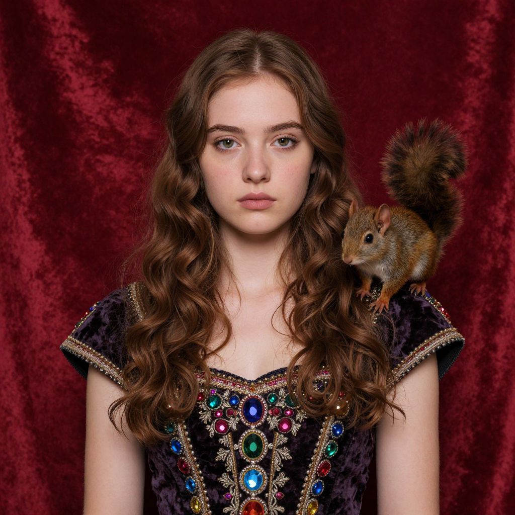 Photograph of a young white woman with long, wavy brown hair and fair skin, wearing a black velvet dress adorned with colorful gemstones and intricate gold embroidery. A small, brown squirrel with a bushy tail perches on her right shoulder. The background is a rich, red velvet curtain that contrasts with her dress. Her expression is neutral, and she gazes directly at the camera. The image has a slightly surreal, fantasy-like quality, blending realistic portrait elements with whimsical, magical details.