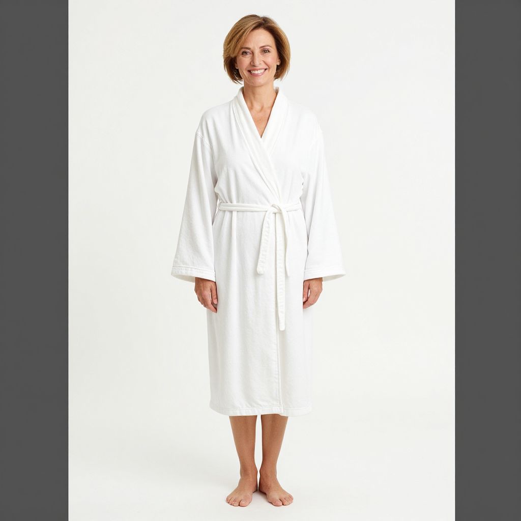 Photograph of a smiling middle-aged woman with short, light brown hair, standing against a plain white background. She's wearing a white, long-sleeved, bathrobe-style robe that reaches just above her knees, and she's barefoot. The robe has a loose fit and a simple, clean design. The image has a gray border on both sides.