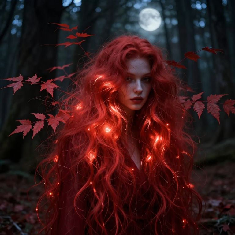 Photograph of a pale-skinned woman with long, wild, fiery red hair illuminated by glowing red light. Her hair and the surrounding leaves are adorned with bright red luminescence. She has a serious expression, with dark red lipstick matching her hair. The background is a dark forest, with tall, shadowy trees and a full moon visible through the trees, creating a mystical and eerie atmosphere. The red and black color palette enhances the supernatural and enchanting feel of the image.