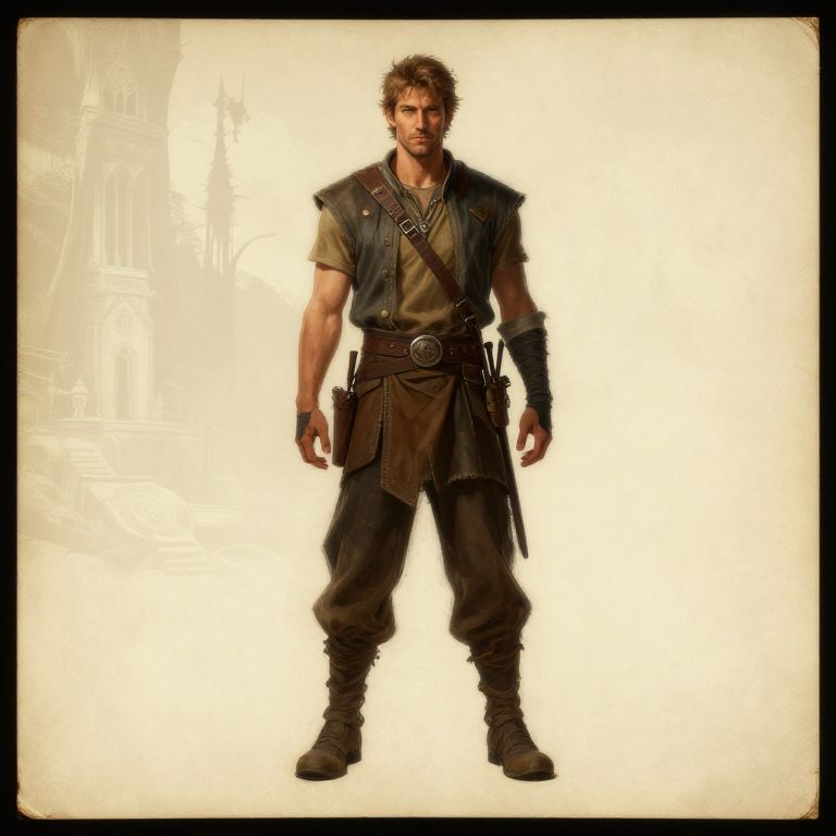 Empty Canvas concept art of fantasy full body male wearing adventurer cloathing and fantasy background In the style of Michele Giorgi and Wayne Reynolds,