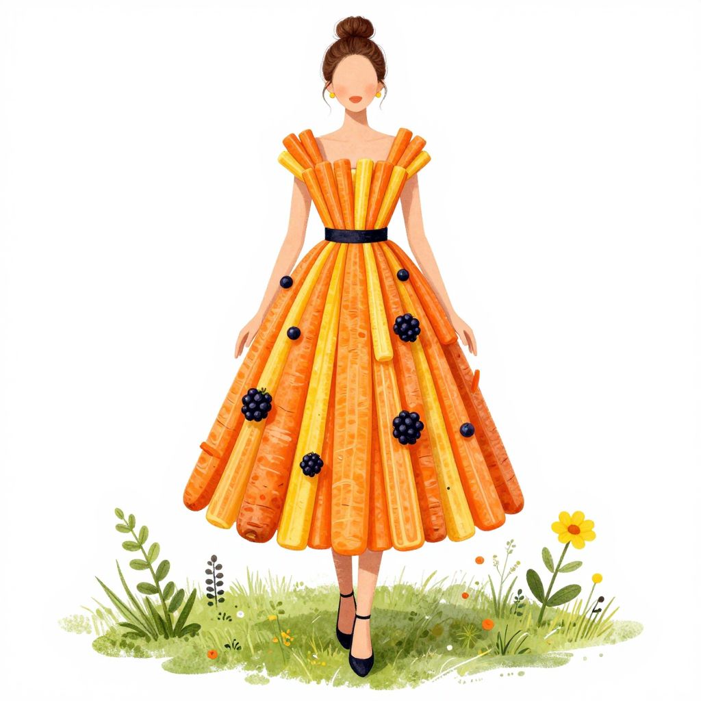 Edgar's creative fashion illustration showcases a woman elegantly dressed in a vibrant dress crafted entirely from orange and yellow carrot sticks, accented with blackberries, standing gracefully on a patch of green grass dotted with small plants and a single yellow flower.