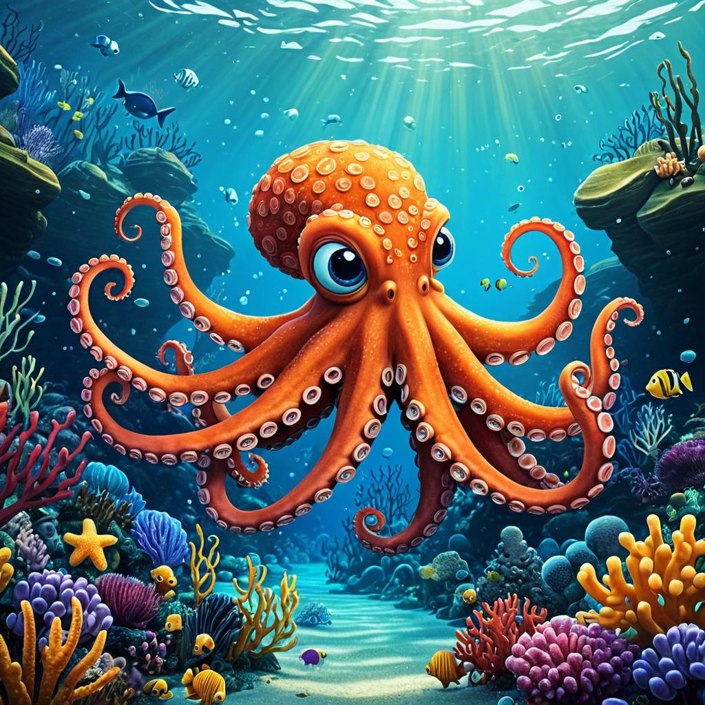 Illustration of a dolphin underwater, surrounded by a kelp forest undersea, conveying gratitude for nature's beauty. Child-friendly, storybook style, fantasy, colorful, HD, cartoon animation