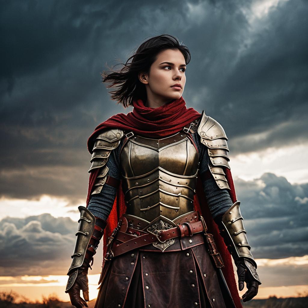 A confident young female warrior standing outdoors at sunset, wearing detailed bronze armor chest plate and gauntlets, red cloth scarf and sleeves, brown leather skirt with belts, short tousled dark hair, cinematic warm lighting, dramatic cloudy sky background, realistic fantasy style