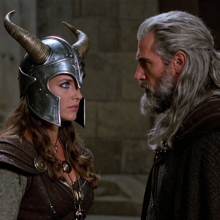 Photograph of a fantasy-themed scene featuring a fair-skinned woman with dark brown hair, wearing a metallic Viking-style helmet with horns, and a black leather top. She has dramatic makeup with dark eyeliner and red lipstick. Beside her is a bearded man with long, dark brown hair, pale blue eyes, and a serious expression. He wears a black, textured, leather-like tunic with metal accents. The background is a blurred stone wall, adding a medieval ambiance. The lighting highlights their faces and creates a dramatic effect. The image has a realistic, high-contrast style.