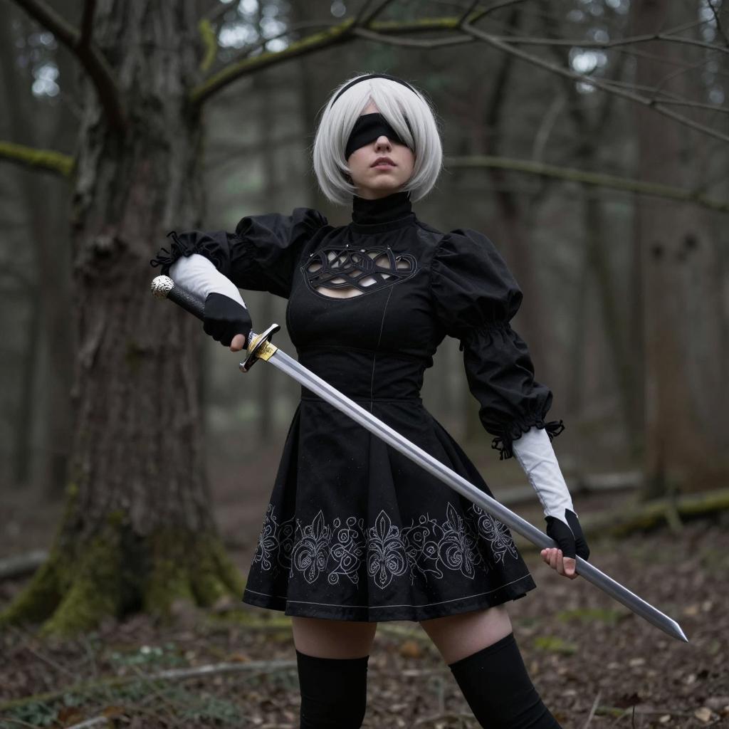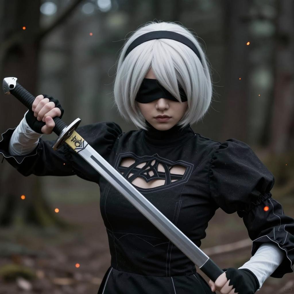 Realistic photo of a female cosplayer with a white bob haircut wearing a black blindfold and a black dress with cutout chest detail. She holds a sword with a white wrap and black pattern in her right hand, standing in a forest setting with falling embers and dark, moody lighting.