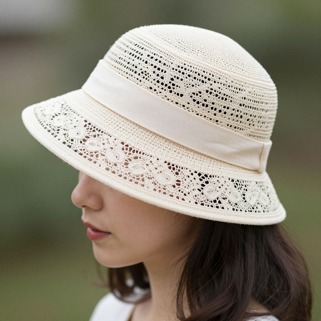 Photograph of a young Asian woman in profile, wearing a white, lace-trimmed sun hat with a wide brim. The lace has intricate black patterns, and the hat features a white ribbon band. Her dark hair is partially visible, tied back. She has fair skin and wears a white top. The background is a blurred mix of green, suggesting an outdoor setting with trees or foliage. Her lips are slightly parted, and she looks downward. The image focuses on the hat, highlighting its delicate lace texture and elegant design.