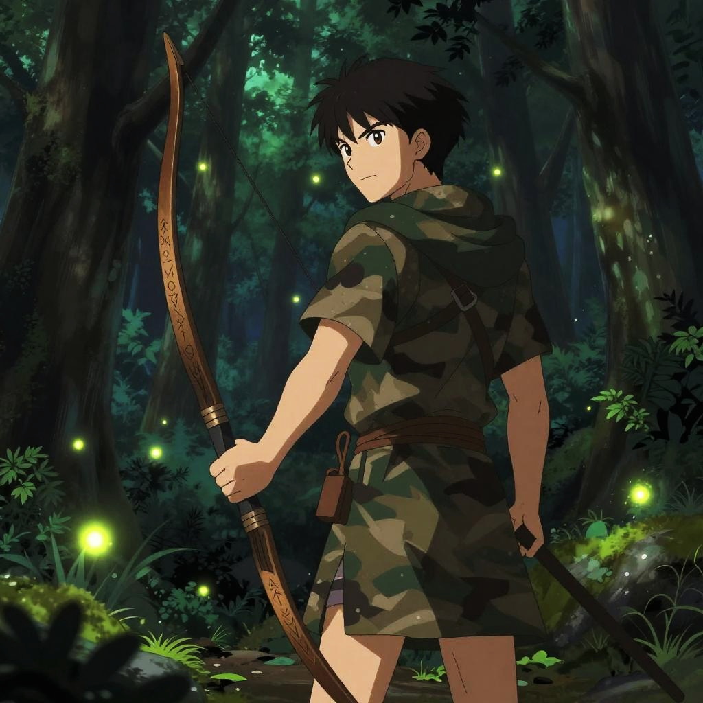 An ancient forest ranger, wearing earth-toned tunic and camouflage cloak, wielding a longbow etched with elven symbols, in a dense mystical woodland glowing with fireflies, drawn in the dark and stylish anime style of Kouta Hirano.