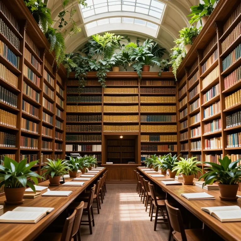 Grand library bathed in natural light, featuring towering wooden shelves lined with golden-hued books, flanked by long wooden tables adorned with open manuscripts and potted plants, all beneath a soaring arched ceiling draped in lush green foliage.