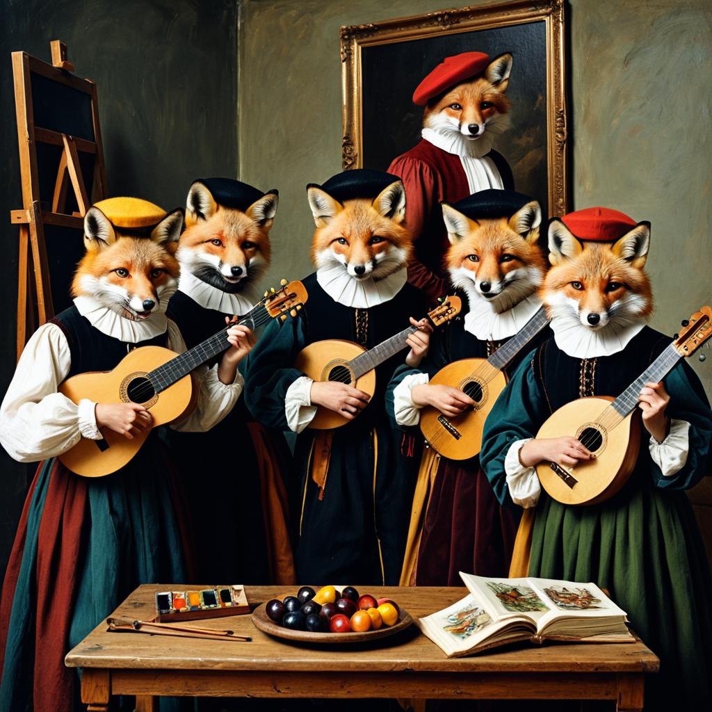 A stained glass mosaic featuring a quartet of anthropomorphic foxes dressed as a jazzy salsa band. They wear flashy red suits with black lapels, white gloves, and gold feathered top hats. Each fox is holding a brass instrument including trumpets and a saxophone. The background displays vibrant blue and orange hues with stylized feathers and floral patterns, adding a nostalgic and whimsical atmosphere.