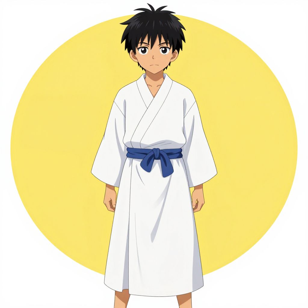 Anime-style drawing of a young boy with black hair, blue eyes, wearing a white karate gi with a blue belt, standing against a yellow circular
