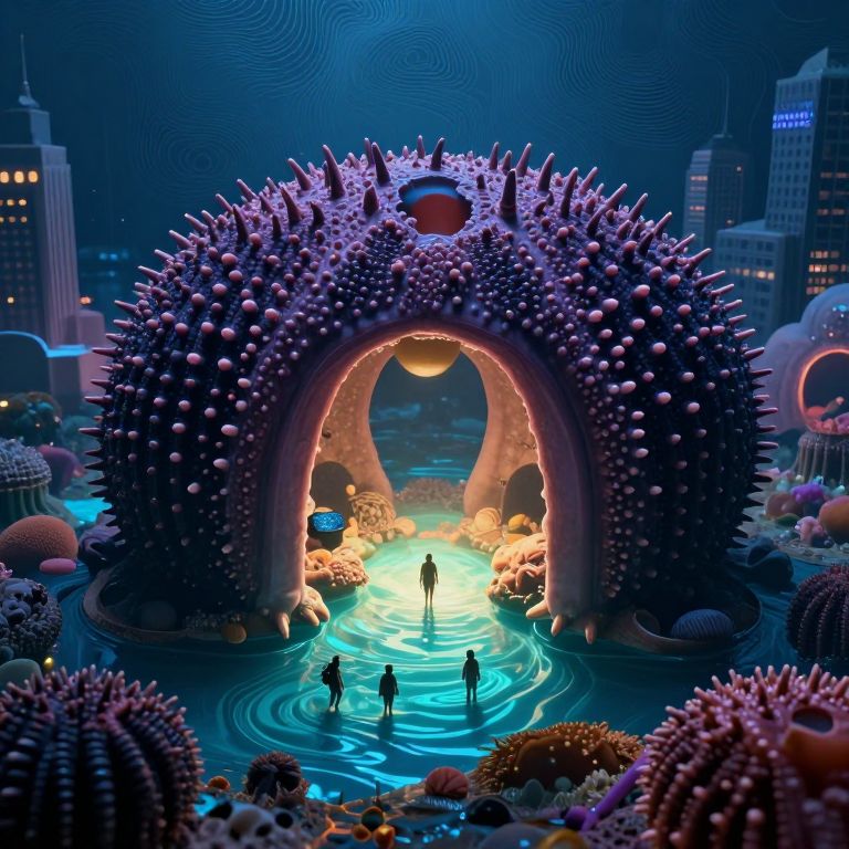 In a surreal city nestled within the pulsating chambers of a colossal sea urchin, the rhythmic hum of moiré patterns lulls the inhabitants into a trance-like state, their steps echoing toward the radiant glow of lagoons that promise both wonder and mystery.