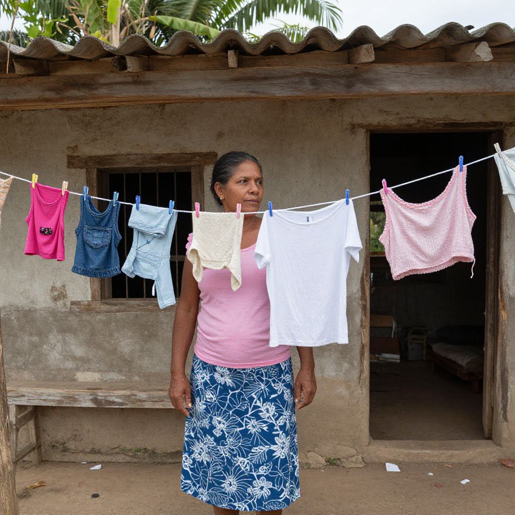 "Weathered 20 year old dominican republic woman hanging up her clothes on a clothesline in her rural home,"