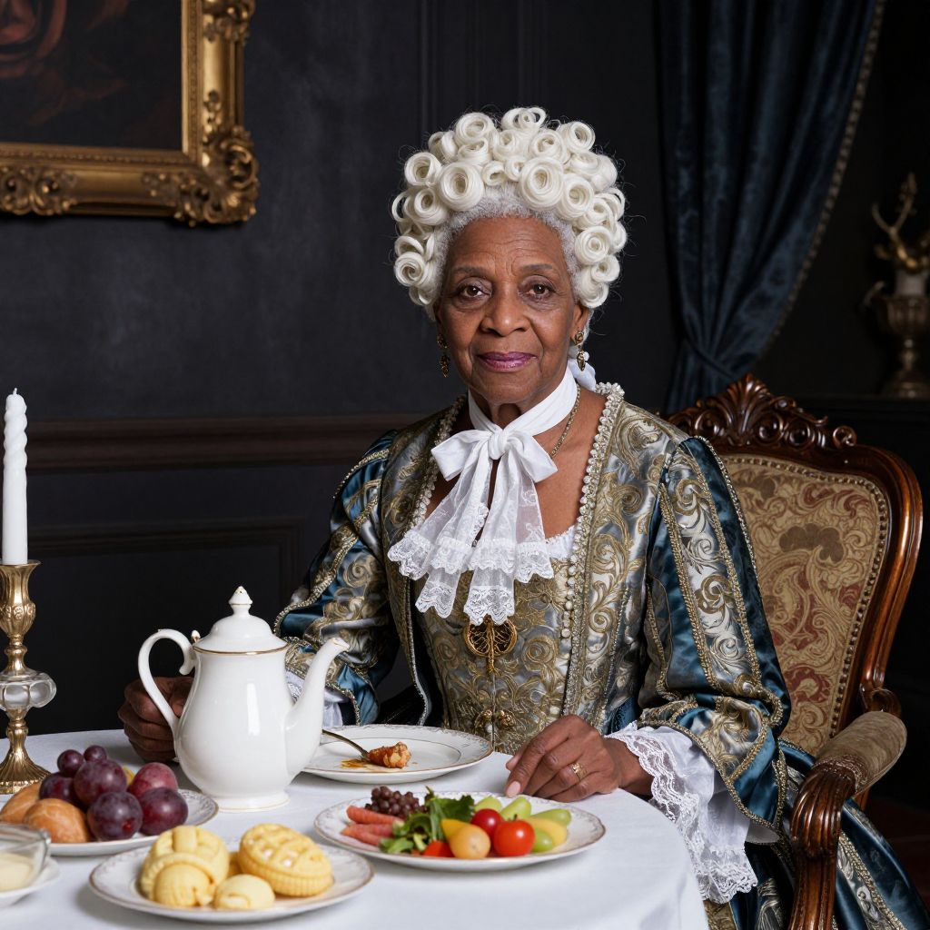 An elderly African American woman in a baroque-style dress and wig sits at a table set with food and a teapot, in a Tim Burton-inspired portrait reminiscent of the court of Louis XVI, photographed by Romina Ressia.