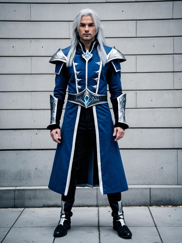 Photo-realistic cosplay photo of person in estinien varlineau costume. Full body. Standing. Full length. 1boy, grey eyes, blue eyes, long hair, white hair, grey hair, elezen, pauldrons