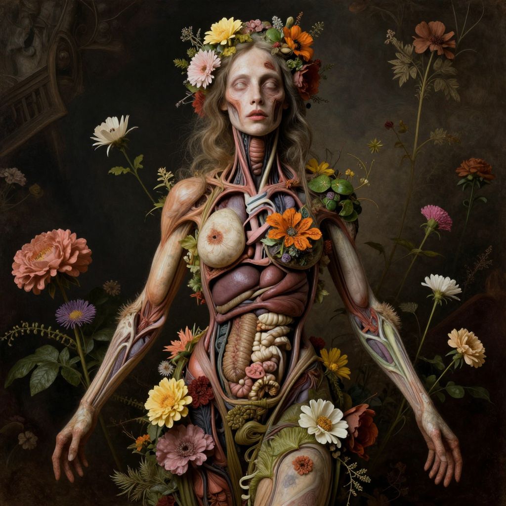Beautiful and detailed rotten woman made of plants and many different types of flowers, muscles, intricate, organs, ornate, surreal, john constable, guy denning, gustave courbet, caravaggio, 1910 polaroid photo