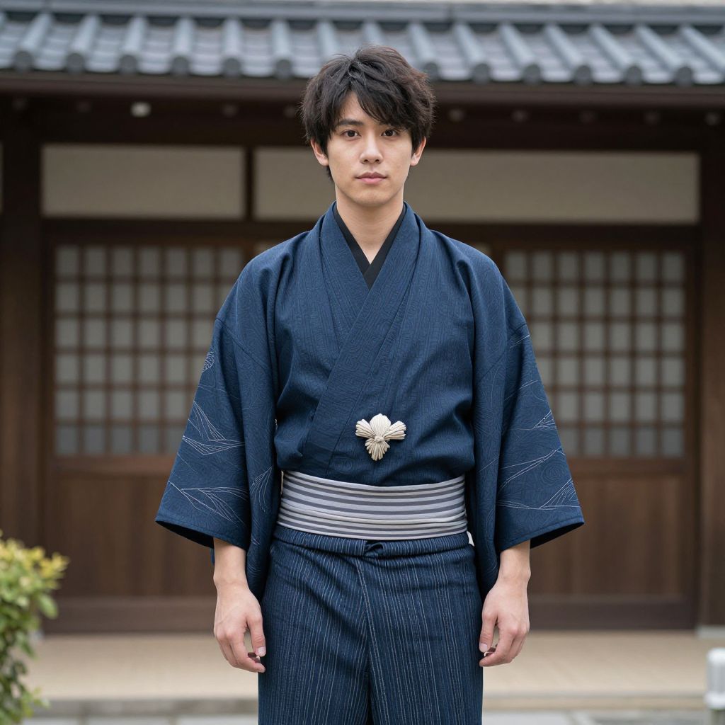 Photograph of a young East Asian man standing in front of a traditional Japanese building. He has short, slightly messy black hair and a neutral expression. He wears a dark blue kimono with subtle white pinstripes, a wide gray and white striped obi belt, and a small white and gold brooch at the center of his chest. The background features wooden sliding doors with grid-patterned windows and a tiled roof. A small green plant is visible on the left. The overall scene has a calm, traditional Japanese aesthetic.