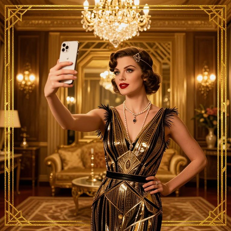 1930s Glamorous Woman Taking Selfie in Gatsby-Style Room