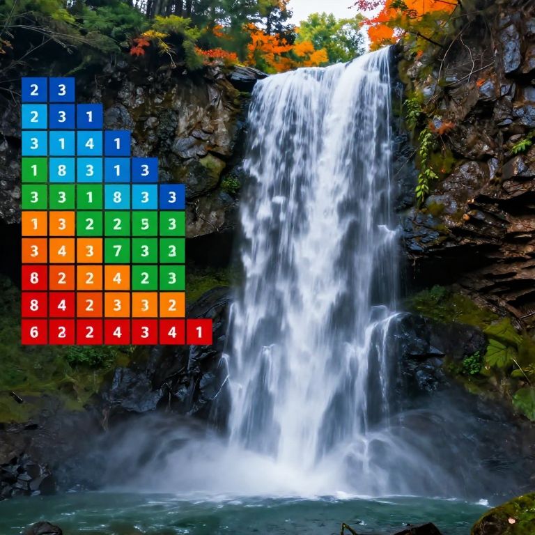 The image depicts a stunning waterfall cascading down a rocky cliff, surrounded by lush greenery and autumn-colored foliage. The waterfall is the central focus, with water flowing vigorously and creating a misty spray at the base. To the left of the waterfall, there is a grid of colored squares, each containing a number, arranged in a pattern that suggests a risk equation. The colors of the squares range from cool blues and greens to warm oranges and reds, creating a visually striking contrast against the natural backdrop. The overall composition is balanced, with the waterfall and the grid of squares creating a dynamic interplay of natural and man-made elements. The scene is rich in texture, from the smooth, flowing water to the rugged, weathered rocks and the vibrant, varied foliage.
