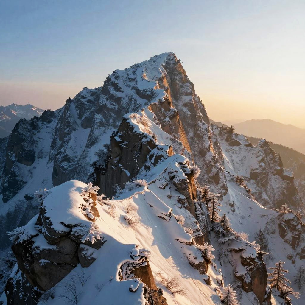 Snow-Capped Peaks, frost-coated mountain crests, clear dawn, early sunrise, Fine detailed brushwork, warm color palette
