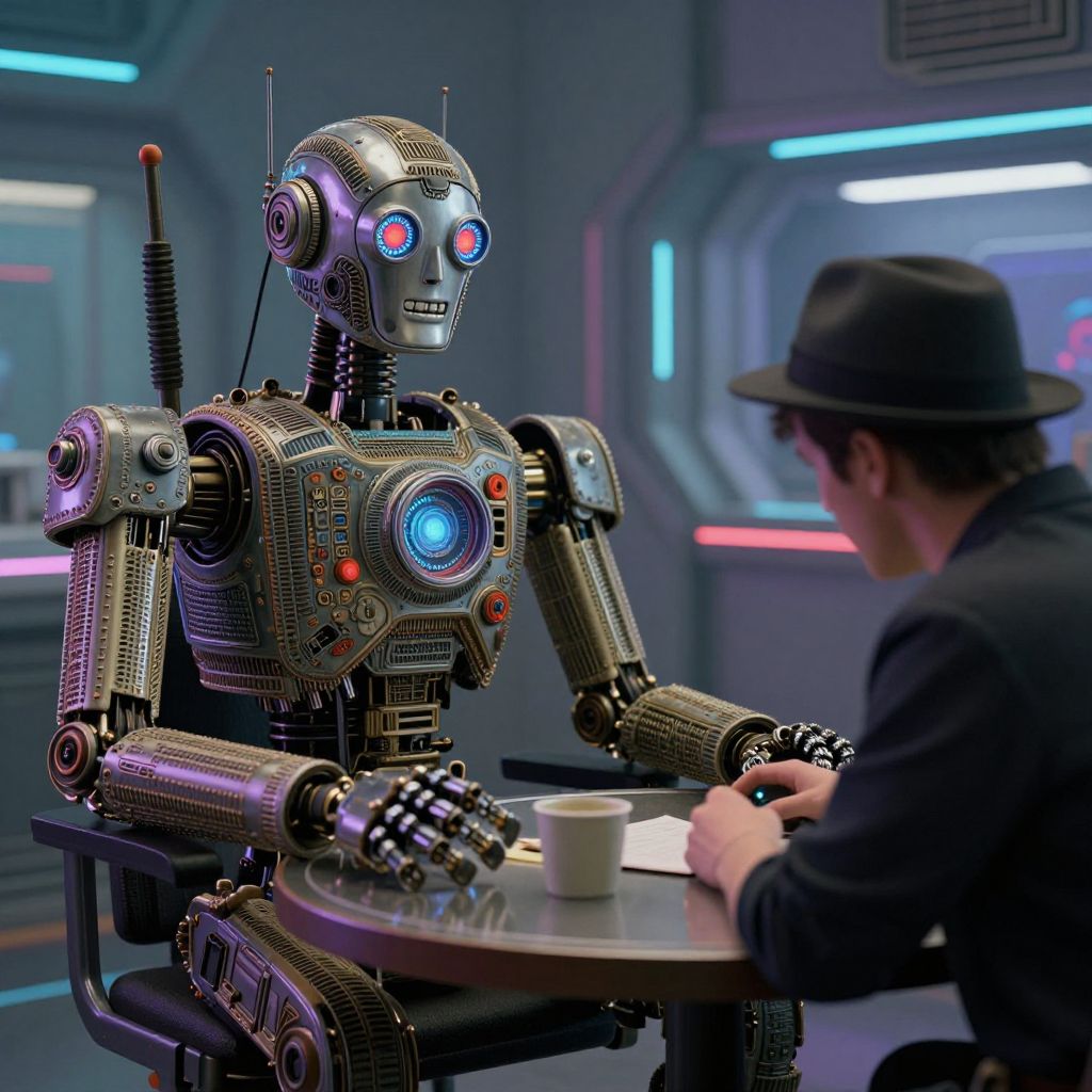 Tavern.ai, an AI-themed fantasy tavern with robots and humans sharing stories, intricate steampunk machinery integrated into wooden tavern architecture, soft glowing lights from magical orbs, crowded tables with digital scrolls and old maps, highly detailed and vibrant atmosphere