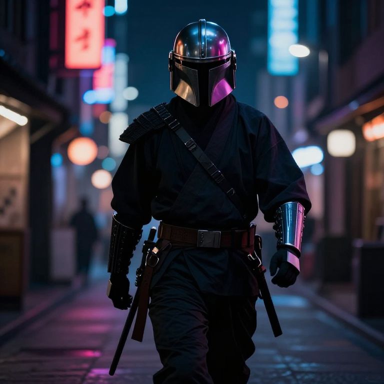 Mandalorian armor female in neon-lit cityscape at night, futuristic armor reflecting vibrant colors, poised with blaster rifle, cyberpunk vibes, rain-soaked streets, detailed design